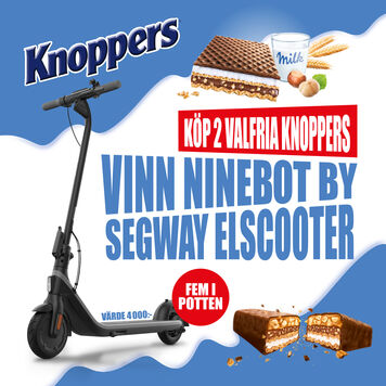 Köp två valfria Knoppers, registrera dig i tävlingen och ha chansen att vinna en Ninebot-elscooter från Segway (värde ca 4 000 kr) samt massor av godis från Knoppers!