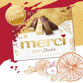 I vinter förtrollar åter merci alla chokladälskare med Winter Chocolate – Limited Edition! De fyra läckra sorterna Vinteräpple, Vinterkaka, Vinterpralin, Apelsin & Mandel finns i en vacker ask och är perfekt att ge bort eller avnjuta själv.